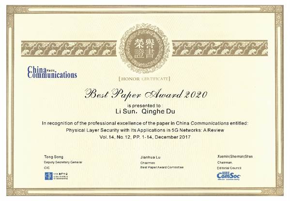 近日,在中国国际通信大会(IEEE/CIC ICCC)开幕式上(网络会议),《China Communications》理事会主席、中国工程院外籍院士、加拿大工程院院士、滑铁卢大学教授沈学民先生宣读了2020年度《China Communications》最佳论文奖获奖名单,西安交通大学信息与通信工程学院教师孙黎、杜清河所撰写的论文:Li Sun, Qinghe Du, Physical Layer Security with Its Applications in 5G Networks: A Review, China Communications, vol. 14, no. 12, pp. 1-14, Dec. 2017获此殊荣。