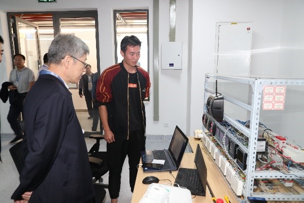 在泓理楼七层的研究院信通学院研究生工作室,除了上课的同学,其他同学基本都在工位工作。迈曾书记与副院长李凡及多位同学亲切交谈,了解学生的生活和学习情况,同学们对创新港的学习生活环境基本满意,并对创新港的运行提出了建设性建议。研究院深地探测科学研究中心的潘志斌老师当时正在工作室指导研究生,书记与潘老师交流了研究院教师在创新港开展科研与研究生指导工作的情况。