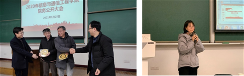 为感谢2020年退休的齐春和张鹏辉两位教师在学院工作中的辛勤付出和贡献,会议举行了学院退休教师荣休仪式,学院向两位老师赠送了纪念品并送上祝福。随后,七位入职教师一一发言,他们表示将继承前辈们的奋斗精神,在信通学院的优秀平台上,努力创造新的科教业绩。