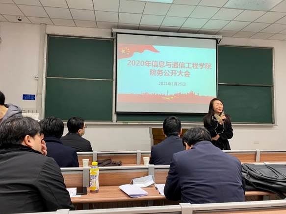 梁莉书记代管晓宏院士对学院院务公开大会表示祝贺,并借用校友路一鸣、樊登在交大求学期间生动的立志往事,寄语信通学院全体教师在学院党政领导班子的带领下,于2021年做出更优异的成绩。