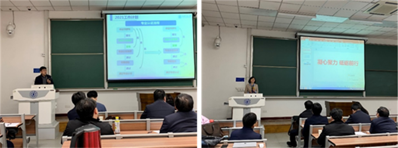随后,副院长李凡从科研到款、重要科研项目、校企合作、基地建设、创新港内涵建设、学科建设等方面对学院科研工作进行了总结,并对2021年学院科研工作目标做了规划,号召全院老师们在2021年向着梦想继续追!副院长范建存在题为“借专业认证之风,扬能力培养之帆”的工作报告中,汇报了2020年疫情之下学院一流专业建设和本科生教学工作所取得的阶段性成果,着重阐述了本科专业认证未来的工作重点和难点。副院长陈娟随后作题为“凝心聚力、砥砺前行”的工作总结报告并述职,将学院2020年的研究生工作总结为四个方面:自强不息,破解科研经费难题;齐心合力,提升学院生源质量;认真严谨,教书育人成果突出;顾全大局,着眼未来勇往直前。院长们的报告,提振了全院老师们的信心,激发了大家在2021年破解难题的热情和决心。