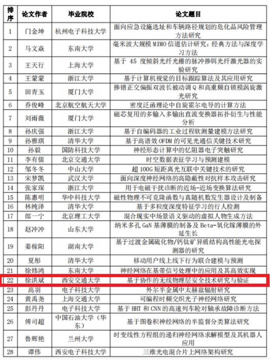 近日,中国电子学会公布了2020年度优秀硕士学位论文评选结果。电信学部信通学院2019届硕士研究生徐洪斌的论文《基于协作的无线物理层安全技术研究与验证》入选中国电子学会2020年度优秀硕士学位论文,指导教师为孙黎副教授。