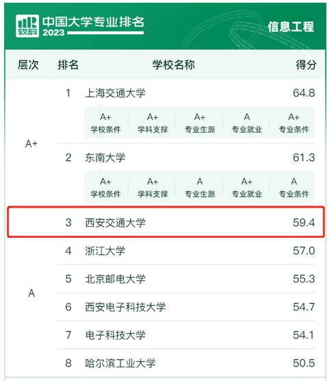 2023年6月15日,高等教育专业评价机构软科正式发布2023“软科中国大学专业排名”。信通学院本科专业“信息工程”在87所以“信息工程”为本科专业的学校中排名第3,位于A层次。
