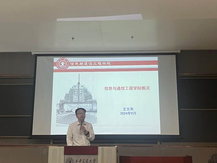 信通学院院长王文杰教授从学科机构沿革与大事记、学科方向、机构设置、教学科研基地、师资力量、杰出校友、研究成果等几个方面对学院和学科进行了介绍。王院长指出学校及学院在科研平台与经费、实验条件和生活配套设施等方面为同学们提供了良好的条件,希望大家能利用好这些资源,积极同导师一起承担国家的重大重点科研项目,成为一名真正的科研工作者。同时王院长期望同学们认真学习,潜心研究,在当前复杂的国际形势之下,站在科技博弈的前沿,为国家和民族做出贡献。王院长最后用校歌《为世界之光》与同学们共勉,激励大家在学术和职业道路上不断前进!