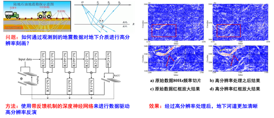 图1展示的是近期课题组在机器学习与地震数据高分辨处理交叉领域取得的最新进展。经机器学习方法处理后,地震数据的分辨率得到显著提升,地下河道信息刻画更加清晰。