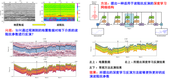 图2展示的是近期课题组将机器深度算法引入到地下介质参数(波阻抗)反演中取得的最新进展。我们构建了一种新的网络结构并提出了新的深度学习方法,该方法与传统方法相比具有反演精度高、计算效率高等优势。